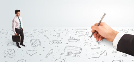 Little businessman looking at hand drawn icons and symbols concept on background