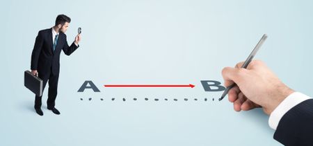 Businessman looking at red line from a to b drawn by hand concept on background
