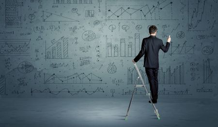 A businessman in modern stylish elegant suit standing on a small ladder and drawing pie and block charts on grey wall background with exponential progressing curves, lines, circles, angles, numbers
