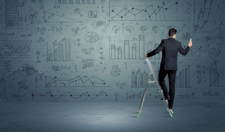 A businessman in modern stylish elegant suit standing on a small ladder and drawing pie and block charts on grey wall background with exponential progressing lines, circles, angles, blocks, numbers
