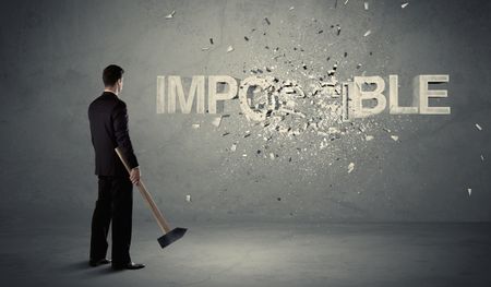 A businessman in modern stylish elegant suit standing on a small ladder and drawing pie and block charts on grey wall background with exponential progressing curves, lines, circles, blocks, numbers