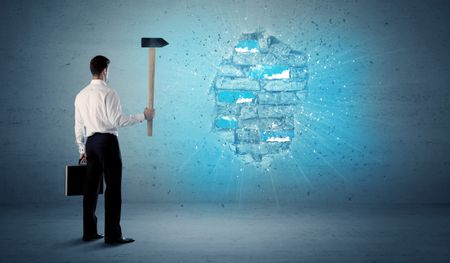 A businessman in modern stylish elegant suit standing on a small ladder and drawing pie and block charts on grey wall background with exponential progressing curves, lines, circles, blocks, numbers