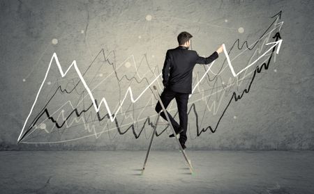 A businessman in modern stylish elegant suit standing on a small ladder and drawing pie and block charts on grey wall background with exponential progressing curves, lines, circles, blocks, numbers