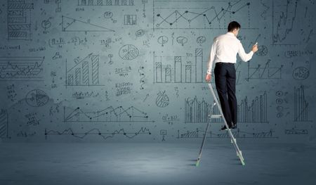 A businessman in modern stylish elegant suit standing on a small ladder and drawing pie and block charts on grey wall background with exponential progressing curves, lines, circles, blocks, numbers