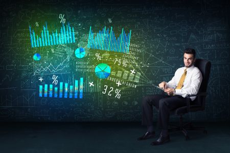 Businessman in office chair with tablet in hand and high tech graph charts concept on background