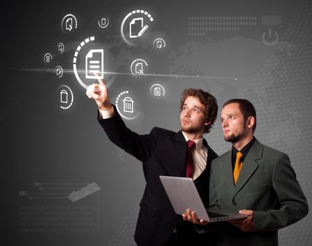 Businessman pressing business type of modern buttons with virtual background