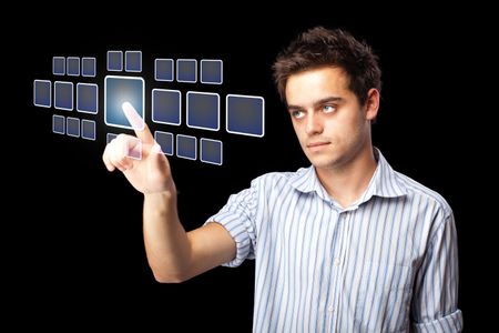 Businessman pressing high tech type of modern buttons on a virtual background