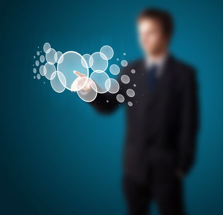 Businessman pressing high tech type of modern buttons on a virtual background