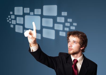 Businessman pressing high tech type of modern buttons on a virtual background