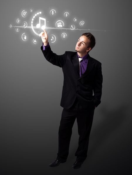 Businessman pressing multimedia type of modern buttons with virtual background