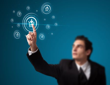 Businessman pressing promotion and shipping type of modern buttons