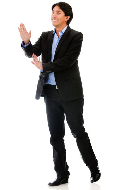 Businessman pushing with his hands - isolated over a white background