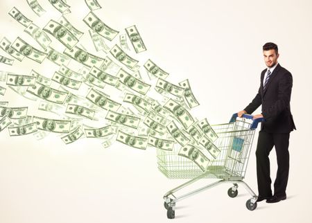 Businessman pushing a shopping cart and dollar bills coming out of it