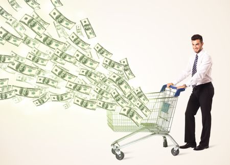 Businessman pushing a shopping cart and dollar bills coming out of it