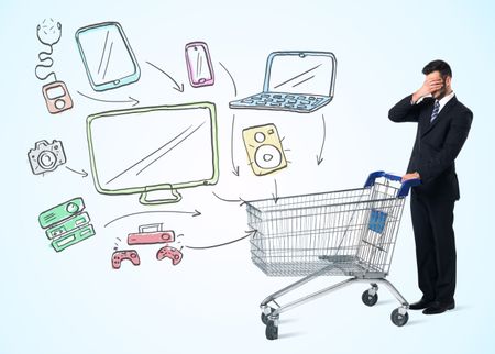 Businessman pushing a shopping cart drawn media devices coming out of it