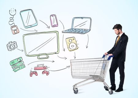 Businessman pushing a shopping cart drawn media devices coming out of it