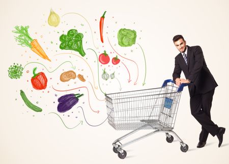 Businessman pushing a shopping cart and healthy vegetables coming out of it