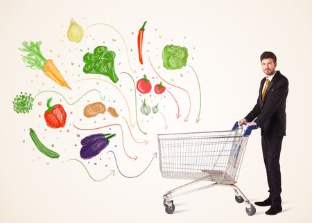 Businessman pushing a shopping cart and healthy vegetables coming out of it