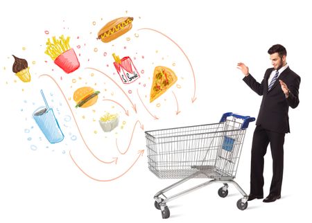 Businessman pushing a shopping cart and toxic junk food and cigarettes coming out of it