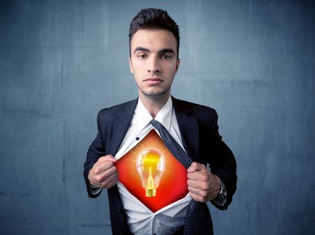 Businessman ripping off shirt and idea light bulb appears on his chest concept on backround