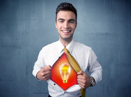 Businessman ripping off shirt and idea light bulb appears on his chest concept on backround