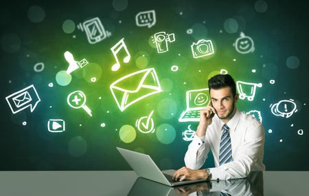 Businessman sitting at the black table with social media symbols on the background