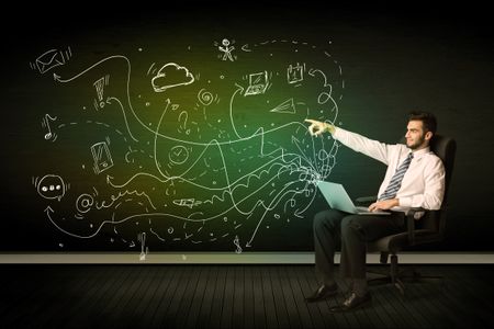 Businessman sitting in chair holding laptop with media icons concept on background
