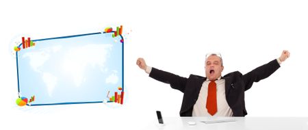 Businessman sitting at desk with copy space, isolated on white