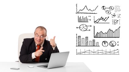 Businessman sitting at desk with diagrams and laptop, isolated on white