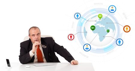 businessman sitting at desk with a globe and social icons, isolated on white