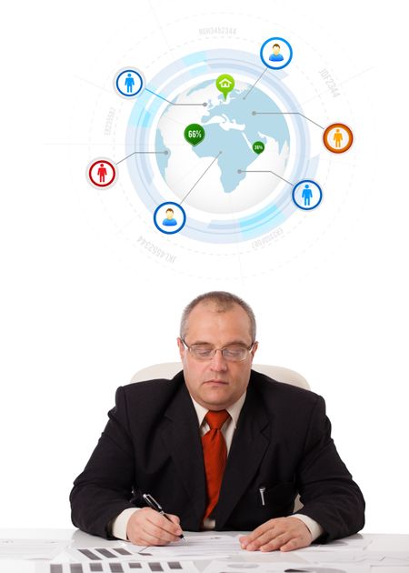 businessman sitting at desk with a globe and social icons, isolated on white