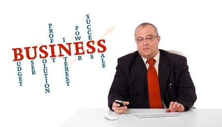 businessman sitting at desk and holding a mobilephone with business word cloud, isolated on white