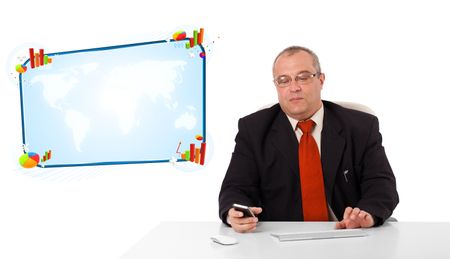 businessman sitting at desk and holding a mobilephone with copy space, isolated on white