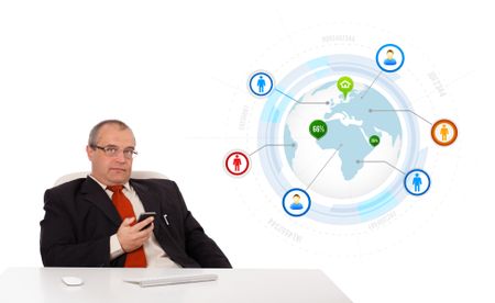 businessman sitting at desk and holding a mobilephone with globe and social icons, isolated on white