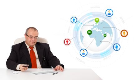 businessman sitting at desk and holding a mobilephone with globe and social icons, isolated on white