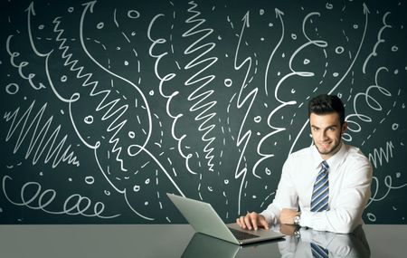 Businessman sitting at table with drawn curly lines and arrows on the background