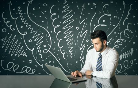 Businessman sitting at table with drawn curly lines and arrows on the background