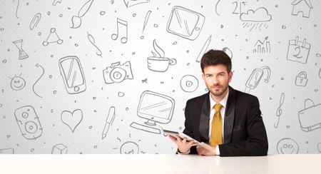 Businessman sitting at table with hand drawn media icons and symbols