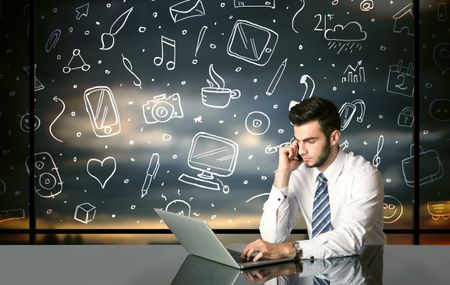Businessman sitting at table with hand drawn social media icons and symbols