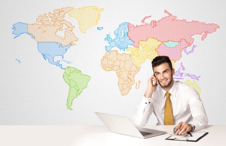 Businessman sitting at white table with colorful world map background