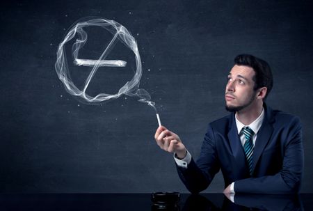 Businessman smoking cigarette and the smoke forms a no smoking sign.
