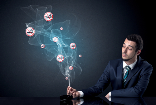 Businessman smoking with floating no smoking signs beside his head.