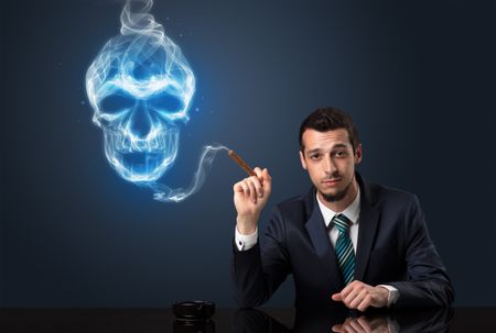Businessman smoking with skull simbol above his head.