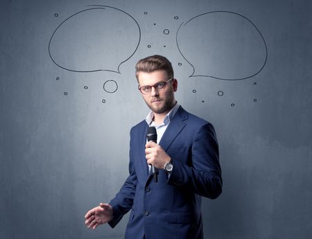 Businessman speaking into microphone with speech bubbles over his head