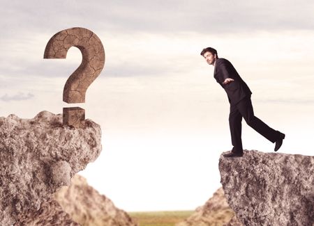 Businessman standing on the edge of mountain with a rock question mark on the other side