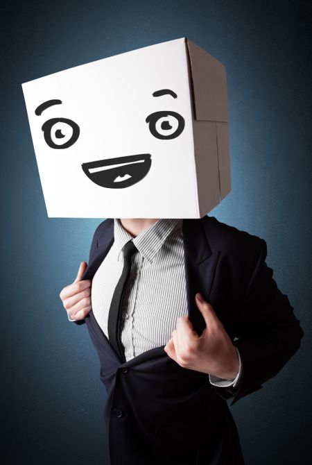 Businessman standing and gesturing with a cardboard box on his head with smiley face