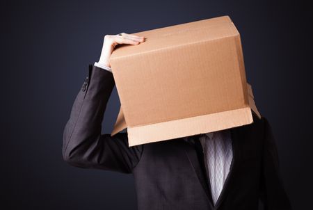 Businessman standing and gesturing with a cardboard box on his head
