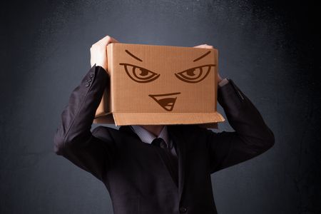 Businessman standing and gesturing with a cardboard box on his head with evil face