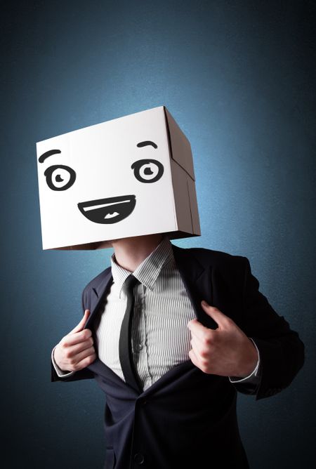 Businessman standing and gesturing with a cardboard box on his head with smiley face