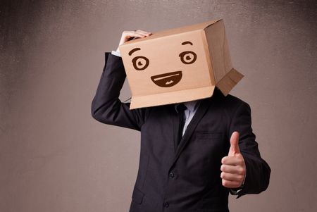 Businessman standing and gesturing with a cardboard box on his head with smiley face